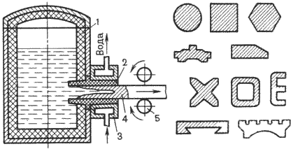 Рис.7.4. Схема непрерывного литья (а) и разновидности получаемых отливок (б)