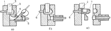 На машинах с горизонтальной холодной камерой прессования (рис.7.1) расплавленный металл заливают в камеру прессования 4 (рис.7.1. а). Затем металл плунжером 5, под давлением 40…100 МПа, подается в полость пресс-формы (рис.7.1. б), состоящей из неподвижной 3 и подвижной 1 полуформ. Внутреннюю полость в отливке получают стержнем 2. После затвердевания отливки пресс-форма раскрывается, стержень 2 извлекается (рис.7.1. в) и отливка 7 выталкивателями 6 удаляется из рабочей полости пресс-формы.