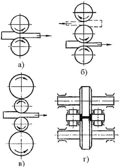 В двухвалковых клетях (рис.10.5. а) осуществляется только по одному пропуску металла в одном направлении. Металл в трехвалковых клетях (рис.10.5. б) движется в одну сторону между нижним и верхним, а в обратную - между средним и верхним валками.