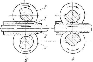 В толстостенную гильзу 1 вводят оправку (дорн) 2 подающего механизма, длина которой больше длины гильзы. Гильза перемещается к валкам 3, калибр которых разделяется на две части: рабочую и холостую. Рабочая часть валка имеет рабочий и калибрующий участки. Процесс работы заключается в периодической подаче на определенную длину гильзы вместе с оправкой в зазор между валками в момент совпадения холостой части обоих валков (рис.11.1 а). Затем выполняется процесс прокатки, и гильза перемещается в направлении вращения валков, т.е. обратном ходу прокатываемой трубы (рис.11.1 б). При этом рабочий участок обжимает гильзу по диаметру и толщине стенки, а калибрующий участок обеспечивает выравнивание диаметра и толщины стенки. После выхода из рабочей части оправка с гильзой продвигаются вперед, поворачиваясь на 900 вокруг продольной оси. По окончании прокатки валки разводят, и подающий механизм обратным ходом вытягивает оправку из трубы.