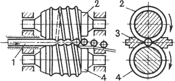 Валки 2 и 4 вращаются в одном направлении, в результате заготовка 1 получает вращательное движение. Для осевого перемещения оси валков располагают под углом к оси вращения. От вылета из валков заготовка предохраняется центрирующими упорами 3. В валках нарезают винтовые калибры. По характеру деформации калибр разделяется на формующий участок, где осуществляется захват заготовки и ее постепенное обжатие в шар, и отделочный участок, где придаются точные размеры шару и происходит его отделение от заготовки. Диаметр валков в 5…6 раз превышает диаметр прокатываемых шаров, и составляет 190…700 мм. Производительность стана определяется числом оборотов валков, так как за один оборот Существуют станы для прокатки ребристых труб, для накатки резьб и т.д.