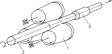 Поперечная прокатка периодических профилей характеризуется тем, что заготовка и готовый профиль представляют собой тела вращения. Схема прокатки на трехвалковом стане представлена на рис.11.3