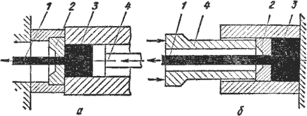 Рис.11.6 Схема прессования прутка прямым (а) и обратным (б) методом