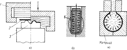 В настоящее время применяют специальные конструкции штампов, в которых металлические пуансоны или матрицы отсутствуют, и давление на материал осуществляется при помощи резины, жидкости или сжатого воздуха (рис.16.2). При этом резина или жидкость легко удаляются из штампованной детали, а матрица должна быть разъемной.