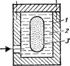 При гидростатическом формовании (рис.16.5) на порошок 3, заключенный в эластичную оболочку 2, передается давление с помощью жидкости, находящейся в сосуде высокого давления 1. В качестве рабочей жидкости используют масло, глицерин, воду и т.д.