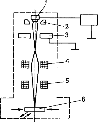 Электроны, испускаемые катодом 1 электронной пушки, формируются в пучок электродом 2, расположенным непосредственно за катодом, ускоряются под действием разности потенциалов между катодом и анодом 3, составляющей 20…150 кВ и выше, затем фокусируются в виде луча и направляются специальной отклоняющей магнитной системой 5 на обрабатываемое изделие 6. На формирующий электрод 2 подается отрицательный или нулевой по отношению к катоду потенциал. Фокусировкой достигается высокая удельная мощность луча. Ток электронного луча невелик - от нескольких миллиампер до единиц ампер.