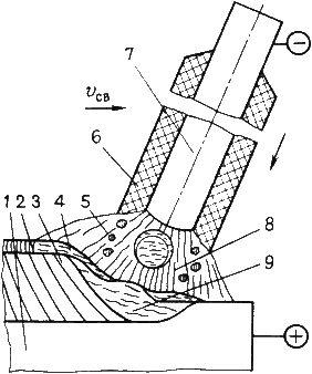 Стержень электрода плавится, и расплавленный металл каплями стекает в сварочную ванну 9. Вместе со стержнем плавится покрытие электрода 6, образуя защитную газовую атмосферу 5 вокруг дуги и жидкую шлаковую ванну 4 на поверхности расплавленного металла. По мере движения дуги сварочная ванна затвердевает и формируется сварной шов 3. Жидкий шлак образует твердую шлаковую корку 2.