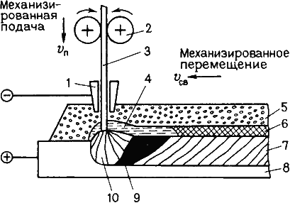 Подача и перемещение электродной проволоки механизированы. Автоматизированы процессы зажигания дуги и заварки кратера в конце шва. Дуга 10 горит между проволокой 3 и основным металлом 8. Столб дуги и металлическая ванна жидкого металла 9 со всех сторон плотно закрыты слоем флюса 5 толщиной 30…50 мм. Часть флюса плавится и образуется жидкий шлак 4, защищающий жидкий металл от воздуха. Качество защиты лучше, чем при ручной дуговой сварке. По мере поступательного движения электрода металлическая и шлаковая ванны затвердевают с образованием сварного шва 7, покрытого твердой шлаковой коркой 6. Проволоку подают в дугу с помощью механизма подачи 2. Ток к электроду подводят через токопровод 1.