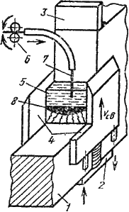 Свариваемые заготовки 1 устанавливают в вертикальном положении. В замкнутое пространство между водоохлаждаемыми медными ползунами 4 и вертикально установленными кромками изделий засыпают флюс и подают электродную проволоку 7 при помощи специального механизма подачи 6.