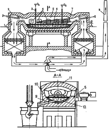 Современная мартеновская печь представляет собой вытянутую в горизонтальном направлении камеру, сложенную из огнеупорного кирпича. Рабочее плавильное пространство ограничено снизу подиной 12, сверху сводом 11, а с боков передней 5 и задней 10 стенками. Подина имеет форму ванны с откосами по направлению к стенкам печи. В передней стенке имеются загрузочные окна 4 для подачи шихты и флюса, а в задней - отверстие 9 для выпуска готовой стали.