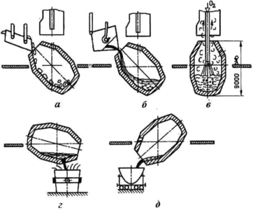 Перед плавкой конвертер наклоняют, с помощью завалочных машин загружают скрап рис. (2.3 а), заливают чугун при температуре 1250…1400 0C (рис.2.3 б).