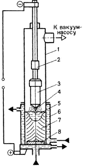 Расходуемый электрод 3 закрепляют на водоохлаждаемом штоке 2 и помещают в корпус печи 1 и далее в медную водоохлаждаемую изложницу 6. Из корпуса печи откачивают воздух до остаточного давления 0,00133 кПа. При подаче напряжения между расходуемым электродом 3 (катодом) и затравкой 8 (анодом) возникает дуга. Выделяющаяся теплота расплавляет конец электрода. Капли жидкого металла 4, проходя зону дугового разряда дегазируются, заполняют изложницу и затвердевают, образуя слиток 7. Дуга горит между электродом и жидким металлом 5 в верхней части слитка на протяжении всей плавки. Охлаждение слитка и разогрев жидкого металла создают условия для направленного затвердевания слитка. Следовательно, неметаллические включения сосредоточиваются в верхней части слитка, усадочная раковина мала. Слиток характеризуется высокой равномерностью химического состава, повышенными механическими свойствами. Изготавливают детали турбин, двигателей, авиационных конструкций. Масса слитков достигает 50 тонн.