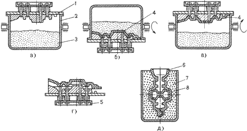 Затем плиту 1 закрепляют на опрокидывающемся бункере 2 с формовочной смесью 3 (Рис.6.1. а) и поворачивают на 180 0 (Рис.6.1. б). Формовочную смесь выдерживают на плите 10…30 секунд. Под действием теплоты, исходящей от модельной плиты, термореактивная смола в приграничном слое расплавляется, склеивает песчинки и отвердевает с образованием песчано-смоляной оболочки 4, толщиной 5…15 мм. Бункер возвращается в исходное положение (Рис.6.1. в), излишки формовочной смеси осыпаются с оболочки. Модельная плита с полутвердой оболочкой 4 снимается с бункера и прокаливается в печи при температуре 300…350? C, при этом смола переходит в твердое необратимое состояние. Твердая оболочка снимается с модели с помощью выталкивателей 5 (Рис.6.1. г). Аналогичным образом получают вторую полуформу.