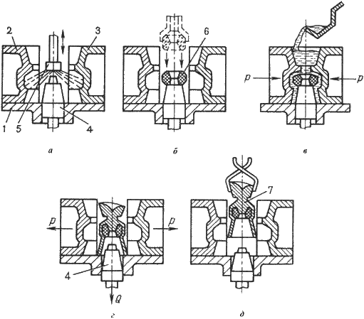Половинки кокиля соединяют и заливают расплав. После затвердевания отливки 7 (Рис.6.3. в) и охлаждения ее до температуры выбивки кокиль раскрывают (Рис.6.3. г) и протягивают вниз металлический стержень 4. Отливка 7 удаляется манипулятором из кокиля (Рис.6.3. д).