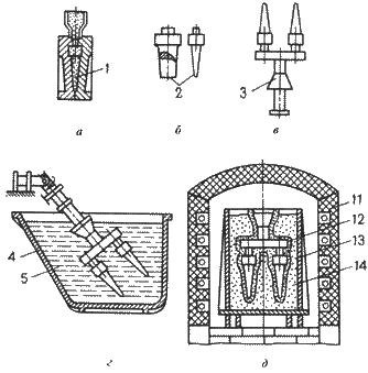 Формы изготавливают многократным погружением модельного блока 3 в специальную жидкую огнеупорную смесь 5, налитую в емкость 4 (Рис.6.2. г) с последующей обсыпкой кварцевым песком. Затем модельные блоки сушат на воздухе или в среде аммиака. Обычно наносят 3…5 слоев огнеупорного покрытия с последующей сушкой каждого слоя.