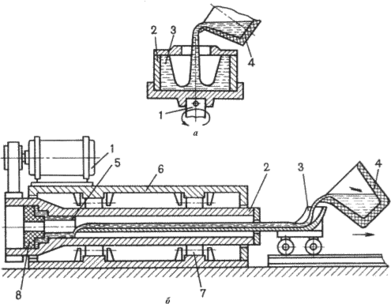 При получении отливок типа тел вращения большой длины (трубы, втулки) на машинах с горизонтальной осью вращения (Рис.6.4. б) изложницу 2 устанавливают на опорные ролики 7 и закрывают кожухом 6. Изложница приводится в движение электродвигателем 1. Расплавленный металл из ковша 4 заливают через желоб 3, который в процессе заливки металла перемещается, что обеспечивает получение равностенной отливки 5. Для образования раструба трубы используют песчаный или оболочковый стержень 8. После затвердевания металла готовую отливку извлекают специальным приспособлением.