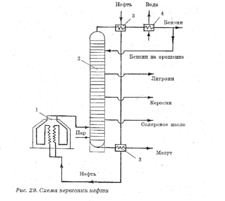 Перегонка нефти производится на атмосферных или атмосферно-вакуумных установках, состоящих их трубчатой печи 1, ректификационной колонны 2, теплообменников 3, насосов и других аппаратов.