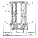 Процесс коксования протекает в коксовых печах , представляющих собой щелевидные камеры 2 шириной 0,4 м, высотой 4 м и длиной 14-15 м, сложенные из огнеупорного материала. В своде такой камеры имеются отверстия — люки для загрузки угля. Несколько десятков вечей (до 75), расположенных параллельно друг другу и связанных кирпичной кладкой, образуют коксовую батарею. В простенках между печами располагаются отопительные каналы 1. В них сжигается какое-либо газообразное топливо. Полученное при этой тепло через стенки печей, передается загруженному в них углю.