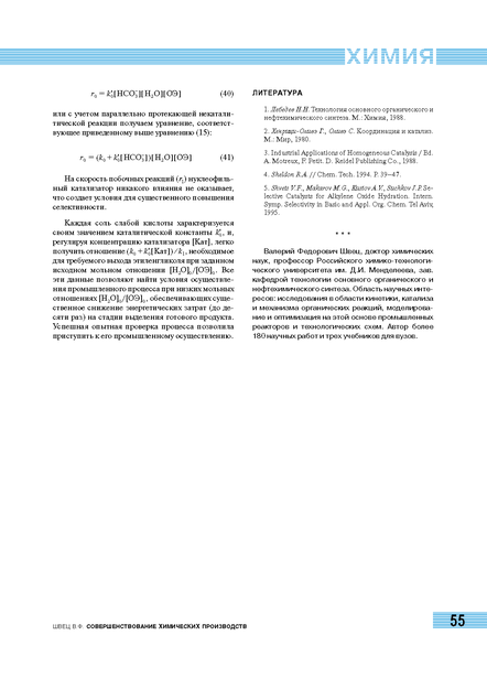 Валерий Федорович Швец, доктор химических наук, профессор Российского химико-технологического университета им.Д.И. Менделеева, зав. кафедрой технологии основного органического и нефтехимического синтеза. Область научных интересов: исследования в области кинетики, катализа и механизма органических реакций, моделирование и оптимизация на этой основе промышленных реакторов и технологических схем. Автор более 180 научных работ и трех учебников для вузов.