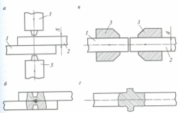 Существуют многочисленные способы холодной сварки, но наиболее широко используются точечная и шовная для нахлесточных соединений и стыковая для получения соединений встык (рис. 2.15).
