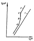 Первый режим - пленочный - наблюдается при небольших плотностях орошения и малых скоростях газа. Количество задерживаемой в насадке жидкости при этом режиме практически не зависит от скорости газа. Пленочный режим заканчивается в первой переходной точке (точка А, рисунок 4), называемой точкой подвисания.