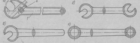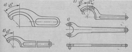 Рис. 11. Гаечные ключи для круглых гаек: а - укороченные; б-с удлиненной рукояткой; в - шарнирные; г - рожковые.