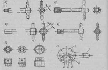 Рис. 12. Гаечные торцовые ключи: а - с наружным шестигранником; б - с внутренним шестигранником; в - с наружным квадратом; г-с внутренним квадратом; д - сменные головки; е - фрикционный ключ.