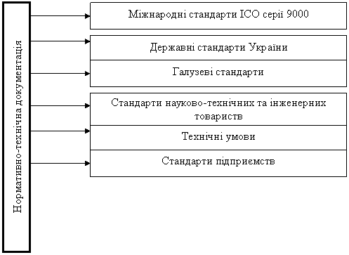 Результати стандартизації знаходять відображення у спеціальній нормативно-технічній документації. Основними її видами є стандарти і технічні умови – документи, що містять обов’язкові для продуцентів норми якості виробу і засоби їх досягнення (набір показників якості, рівень кожного з них, методи і засоби вимірювання, випробувань, маркування, упаковки, транспортування і зберігання продукції). Застосовувана на підприємствах нормативно-технічна документація охоплює певні категорії стандартів, які відрізняються ступенем жорстокості вимог до виробів і сукупністю об’єктів стандартизації (рис.1).