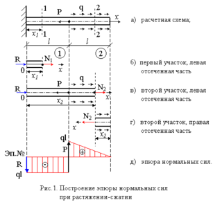На основе полученных данных строится эпюра нормальных сил в виде графика распределения нормальной силы по длине бруса (рис.1 д). Характерно, что скачки на эпюре обусловлены наличием в соответствующих сечениях сосредоточенных сил R и Р.