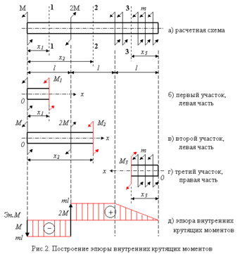Рассмотрим расчетную схему вала, нагруженного двумя сосредоточенными моментами М и 2М и распределенными по длине: m, рис.2.