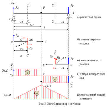 Рассмотрим ВТОРОЙ ХАРАКТЕРНЫЙ ПРИМЕР ИЗГИБА двухопорной балки (рис.3).