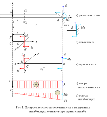 Как известно, при прямом изгибе в поперечном сечении возникают два вида внутренних усилий: поперечная сила и внутренний изгибающий момент.
