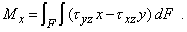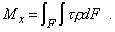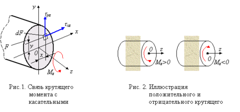 Кручением называется такой вид деформации, при котором в поперечном сечении стержня возникает лишь один силовой фактор - крутящий момент Мz. Крутящий момент по определению равен сумме моментов внутренних сил относительно продольной оси стержня Oz. Нормальные силы, параллельные оси Oz, вклада в крутящий момент не вносят. С силами, лежащими в плоскости поперечного сечения стержня (интенсивности этих сил - касательные напряжения xz и yz) Мz связывает вытекающее из его определения уравнение равновесия статики (рис. 1)