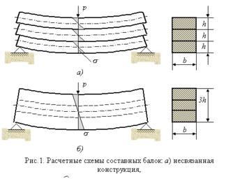 Работу составных балок проиллюстрируем на простом примере трехслойной балки прямоугольного поперечного сечения. Если слои между собой не связаны и силы трения между ними отсутствуют, то каждый из них деформируется как отдельная балка, имеющая свой нейтральный слой (рис. 1, а). Нагрузка между этими балками распределяется пропорционально их жесткостям при изгибе (в данном примере поровну). Это означает, что моменты инерции и моменты сопротивления трех независимо друг от друга деформирующихся балок должны быть просуммированы