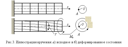Рассмотрим кручение призматических стержней кругового поперечного сечения. Исследование деформаций упругого стержня с нанесенной на его поверхности ортогональной сеткой рисок (рис. 3) позволяет сформулировать следующие предпосылки теории кручения этого стержня: