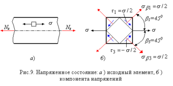 Напряженное состояние при растяжении стержня является одноосным (рис. 9, а). Поскольку на поперечных и продольных площадках касательные напряжения не возникают, то эти площадки являются главными.