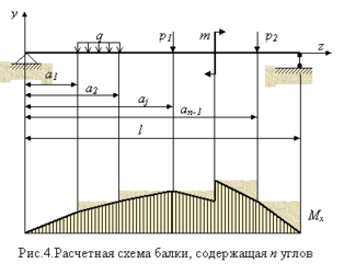 Вернемся к интегрированию уравнения второго порядка. Если имеется несколько участков, для которых правая часть уравнения исходного f(z)=Mx/EJx, содержит разные аналитические выражения, то интегрирование усложняется. На рис. 4 приведена эпюра Мx, содержащая n участков. Для каждого участка независимое интегрирование дает по две константы, а при п участках требуется определить 2n постоянных. Добавляя к двум граничным условиям на опорах 2(n-1) условия непрерывности и гладкости упругой кривой на границе; смежных участков, заключающиеся в равенстве прогибов v и углов поворота сечений dv/dz на этих границах