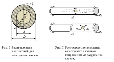 Как показали эксперименты и точное решение этой задачи в теории упругости, все гипотезы, сформулированные ранее для стержня со сплошным круговым сечением, остаются справедливыми и для стержня кольцевого поперечного сечения (рис. 6). Поэтому все выведенные ранее формулы пригодны для расчета стержня кольцевого сечения с той лишь разницей, что полярный момент инерции определяется как разность моментов инерции кругов с диаметрами D и d