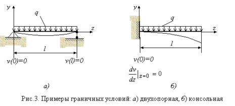 Условия, накладываемые на прогиб и угол поворота сечения, получили название кинематических граничных условий. Как видно, для шарнирно опертой балки требуется, чтобы прогиб на опорах v(0) =v(l) =0, а для консольной балки прогиб и угол поворота сечения в заделке