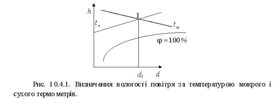 Мокрий термометр показує нижчу температуру, ніж сухий термометр. На h - d - діаграмі на перетині температур сухого tс і мокрого tm термометрів одержимо точку 1, по якій можна визначити відносну вологість і вологовміст d. Відносну вологість можна визначити якщо використовувати психрометричні таблиці.