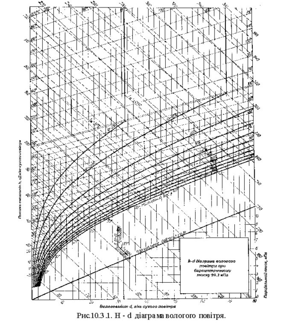 Визначення параметрів і дослідження процесів вологого повітря значно спрощується і стає нагляд ним, якщо використати h-d діаграму волого повітря, запропоновану в 1918 р. професором Л.К. Рамзіннм. На цій діаграмі (рис.10.3.1) по осі ординат відкладають значення ентальпії вологого повітря h кДж/кг сухого повітря, а по осі абсцис - вологовміст d г/кг сух.пов.