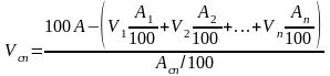 где А — крепость изделия по рецептуре, % об.; V1, V2, …, Vn — объемы полуфабрикатов, вносимые в купаж согласно произведенному расчету, л; А1, А2, ..., Аn — фактические крепости имеющихся в распоряжении полуфабрикатов, % об; Асп — крепость имеющегося спирта, % об.