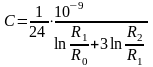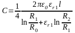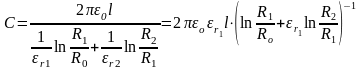 де R0 – радіус внутрішнього електрода, R1 – зовнішній радіус першого діелектричного шару (в нашому випадку картону); R2 – радіус зовнішнього електроду, εr1 – відносна діелектрична проникність першого шару, εr2 = 1, оскільки другий шар – це повітряний зазор. Очевидно, що R1 = R0 + T.