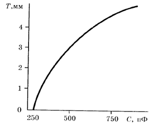 Градуювальну характеристику зображено на рис. 9.2. З характеристики видно, що у діапазоні Т = 0-2 мм характеристика близька до лінійної, якщо радіус R0 опорного барабану 1 дорівнює 100 мм, а ширина l = 1 мм, зазор h між барабаном і електродом 2,5 мм, товщина Т картону змінюється від 0,5 мм до 4 мм, а електрод 2 охоплює ¼ кола барабану.