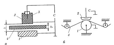 Рисунок 9. 1- Вимірювання товщини діелектричних об’єктів а) листів і пластин, б) паперової стрічки, картону