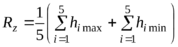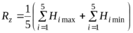 2 - Rz- висота нерівностей профілю по десяти точках - є сума середніх абсолютних відхилень точок п'яти найменших min - Нmin і п'яти найбільших max - Нmax профілю в межах базової довжини.