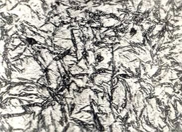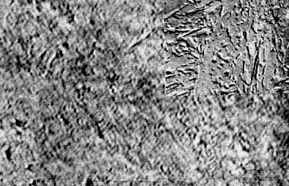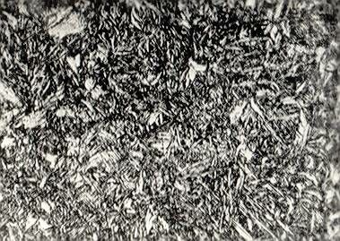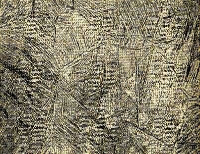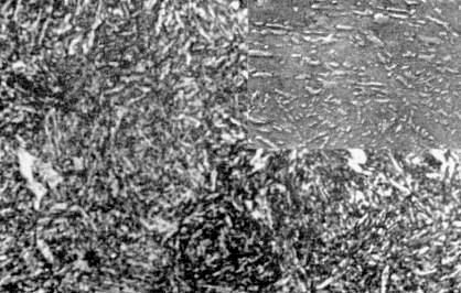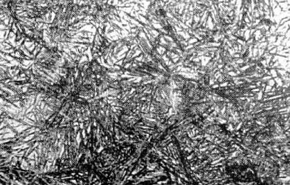 Титановый мартенсит представляет собой пересыщенный твердый раствор -стабилизирующих легирующих элементов в -титане. Кристаллическая решетка у него гексагональная плотноупакованная, напряженная. Мартенситная -фаза не обладает высокой твердостью и прочностью, однако ее твердость и прочность тем больше, чем выше степень пересыщения -твердого раствра легирующим элементом. Под микроскопом эта структура типично игольчатая (рис. 9.3).