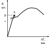 За точкой «е» возникают заметные остаточные деформации, в точке S наблюдается переход к горизонтальной площадке S-S (площадка текучести). Для участка S-S характерен рост деформации без заметного увеличения нагрузки. Если обозначить величину нагрузки, соответствующую площадке текучести, через Рт, то напряжение в этой точке можно вычислить по формуле, что и является физическим пределом текучести.