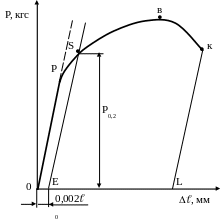 Первый участок диаграммы 0P представляет собой прямую линию, т.е. между Р и соблюдается закон Гука. Напряжение в точке Р есть предел пропорциональности