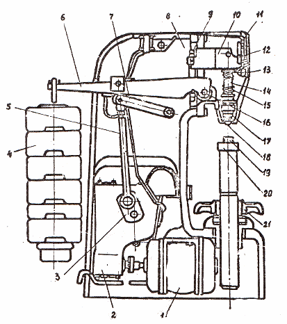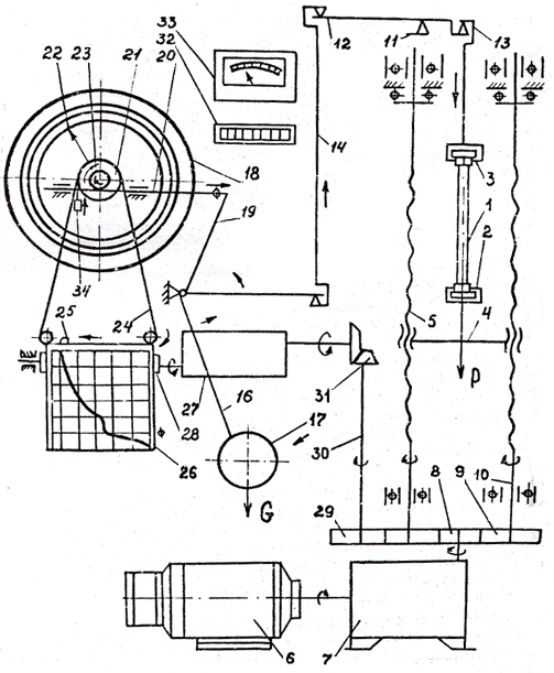 Показанный на схеме груз 34 служит для возврата в исходное положение (к нулю) рабочей стрелки 22 и пера 25 при снятии нагрузки.